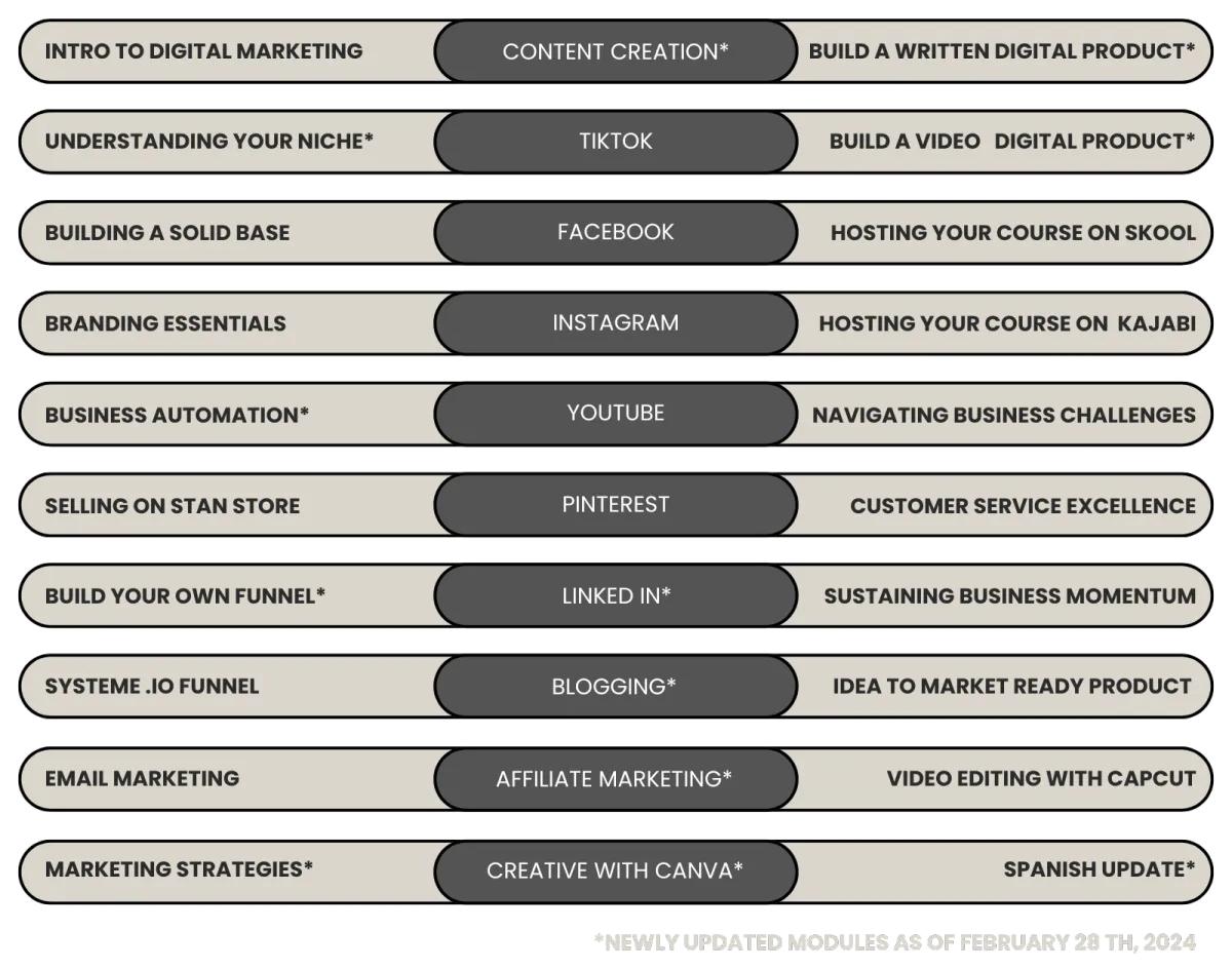In the next section you will see the modules included in this comprehensive course. You will receive immediate access to the course itself and access to a free community of success-minded business owners of all experience levels ready to connect and support! Additionally, you will receive a Master Resell Rights license to sell this product with your own branding.